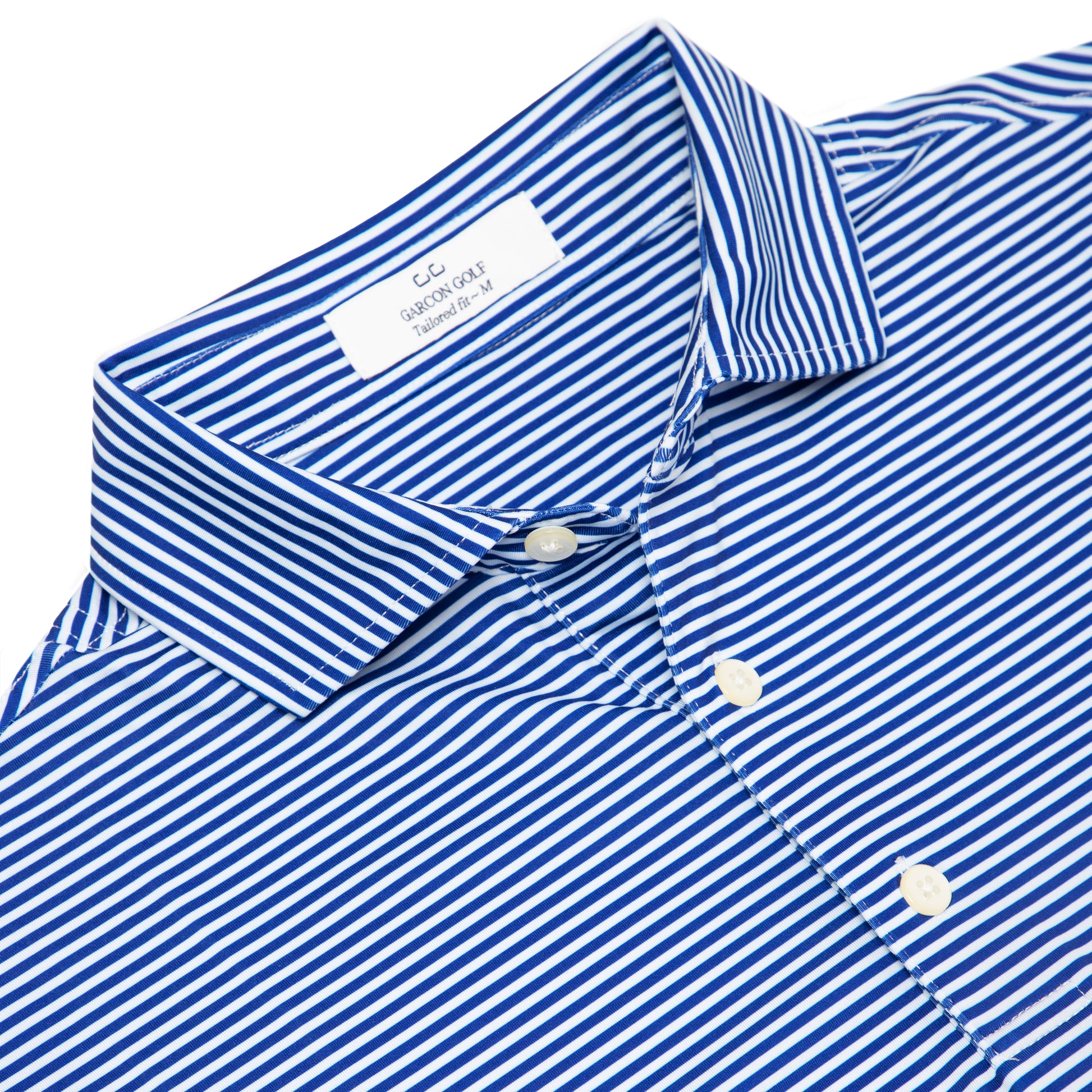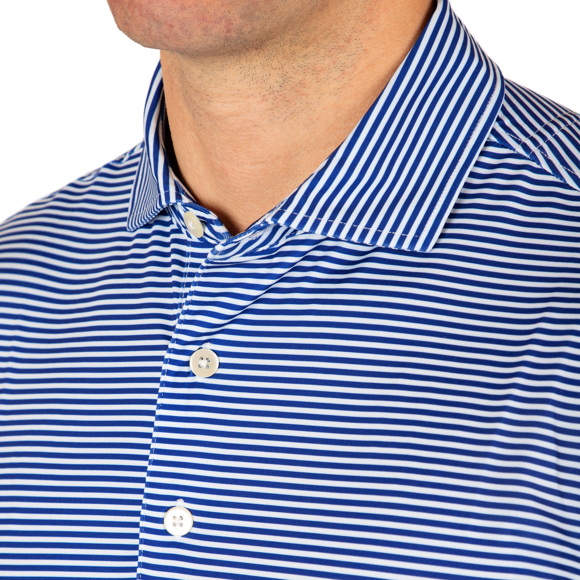 Our striped designed golf shirt, is distinguished by its unique cutaway collar. Crafted with a four-way stretch fabric, this shirt not only showcases a stylish design but also ensures optimal flexibility and comfort for your golfing experience.
